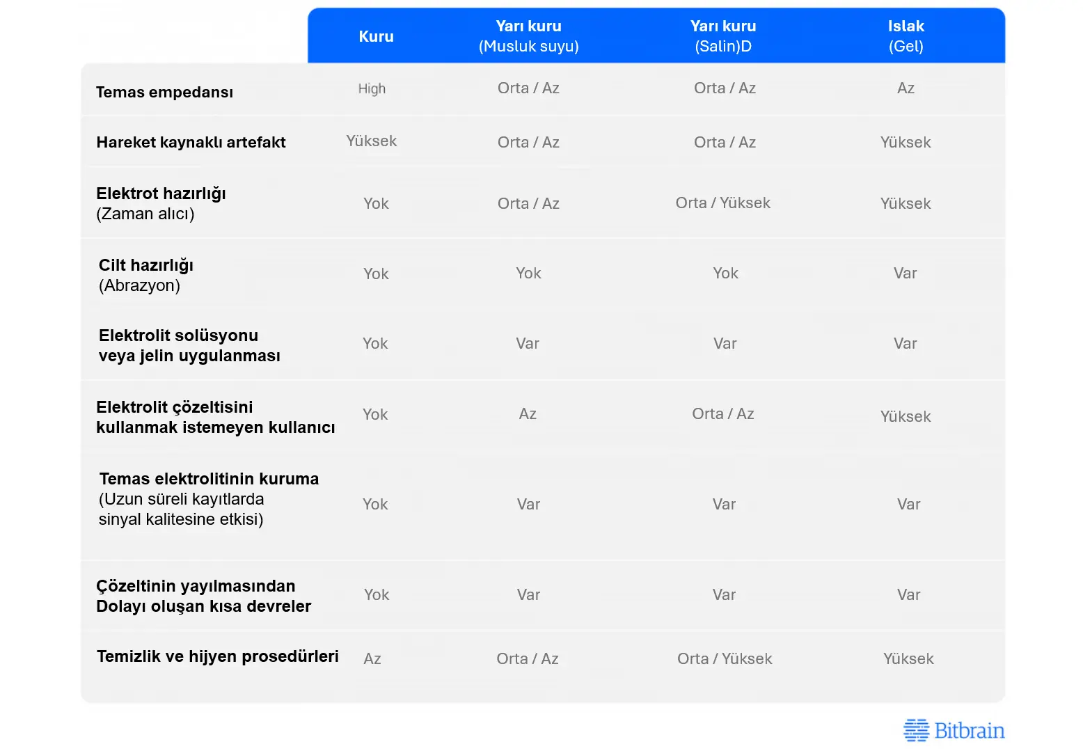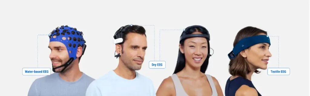 Kuru EEG, yarı kuru EEG, salin EEG, jel EEG elektrotları: Bu elektrotlar arasındaki fark, iletkenliği artırmak amacıyla elektrot ile kafa derisi arasına uygulanan elektrolitik maddedir.