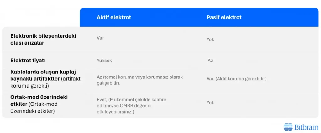 Aşağıdaki tablo, aktif ve pasif elektrot sistemlerinin avantaj ve dezavantajlarını özetlemektedir.