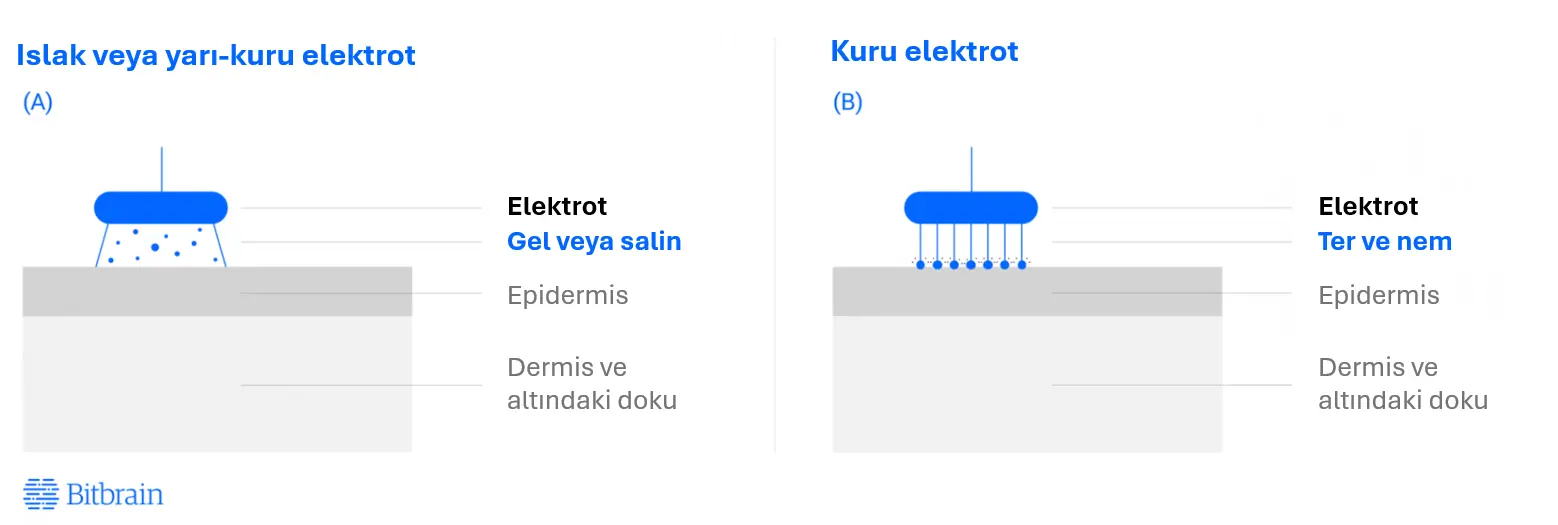 - Kuru EEG elektrotları jel veya sıvı gibi iletken maddeler gerektirmez ve doğrudan saçlı deriye temas eder. En büyük avantajları hızlı takılmaları, ek ekipman gerektirmemeleri, işlem sonrası temizlik zahmeti olmaması ve hijyen sürecinin daha kolay olmasıdır. Dezavantajı ise elektrot ile cilt arasındaki elektriksel direncin yüksek olmasıdır; bu da sinyalde daha fazla gürültü ve bozulmaya yol açar. Bu nedenle jel kullanılan sistemlerle aynı sinyal kalitesini elde etmek için daha güçlü bir amplifikatör gerekir: giriş direnci yüksek olmalı ve elektrik hattı ya da hareket kaynaklı parazitleri azaltan aktif koruma teknikleri bulunmalıdır. (Bkz. Li ve ark., 2018.)