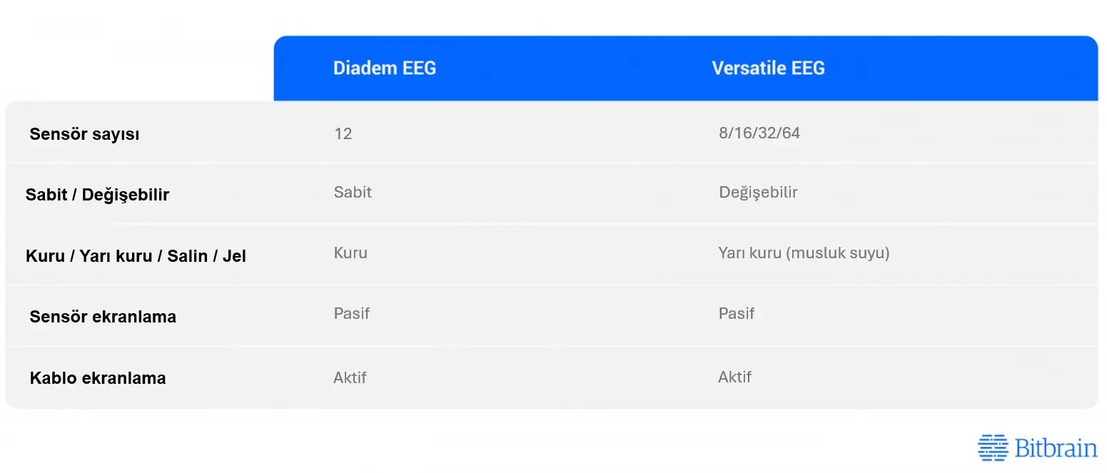 - Kuru veya yarı kuru sensörler için iyi tasarlanmış EEG amplifikatörleri, daha yüksek teknik kapasiteye sahip oldukları için jel ya da tuzlu su kullanılan sistemlerle de sorunsuz çalışabilir. Ancak tersi geçerli değildir; uygun olmayan bir amplifikatörle kuru/yarı kuru sensör kullanılırsa sinyal kalitesi düşer ve gürültü ile bozulmalar artar.