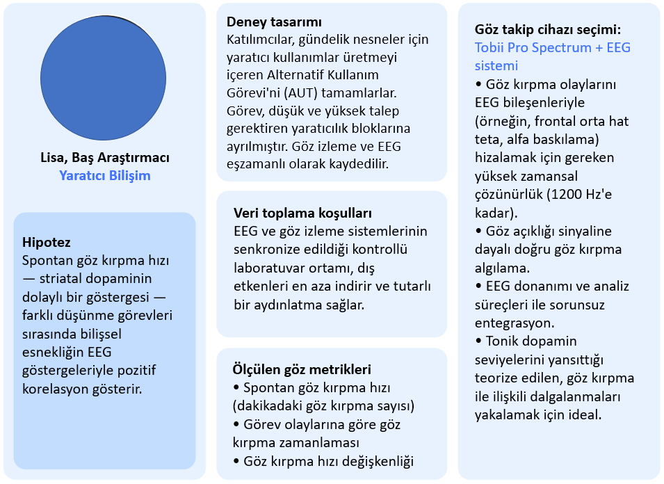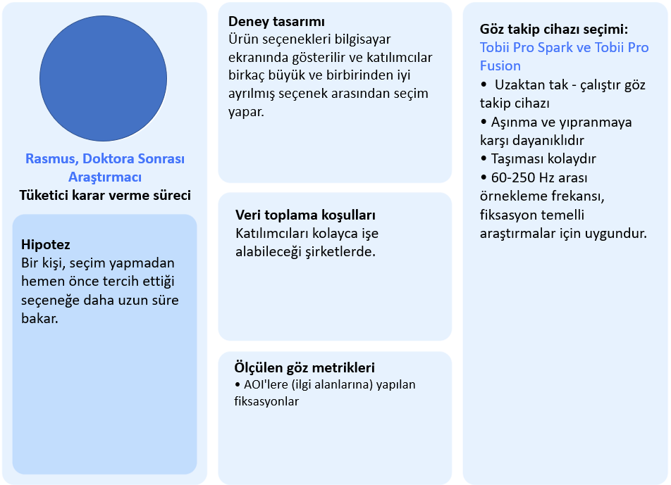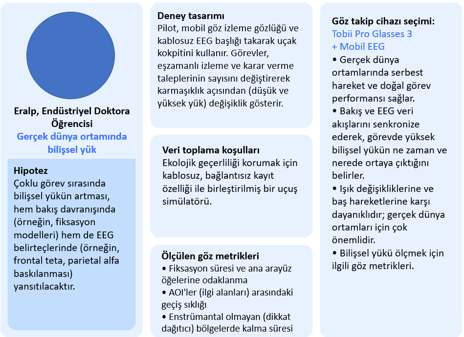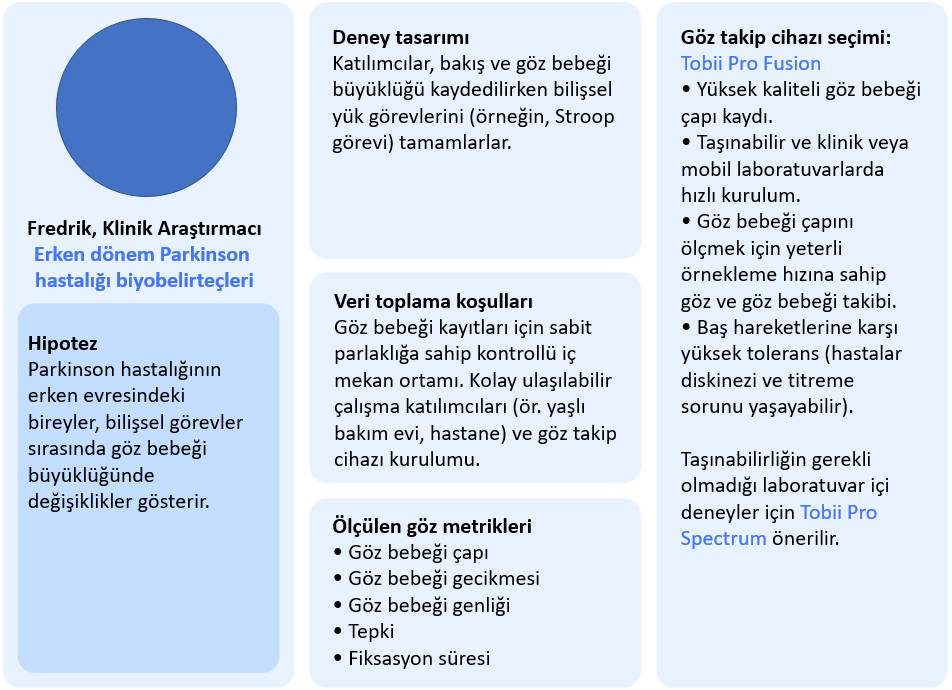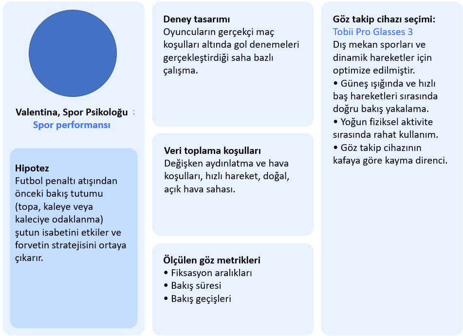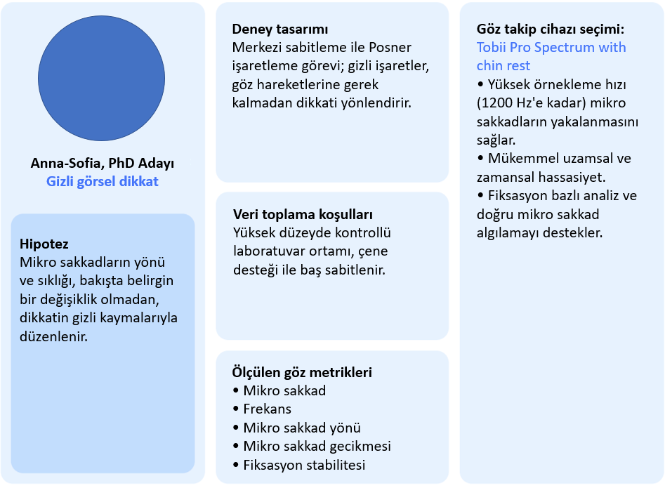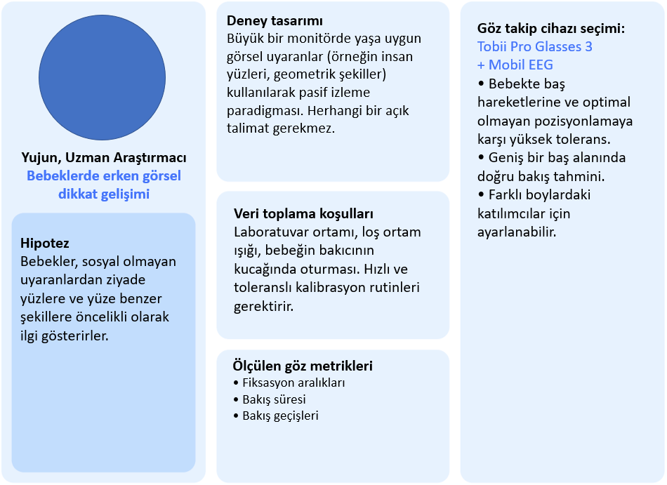 Farklı göz izleme çözümlerinin çok çeşitli araştırma ihtiyaçlarını nasıl karşıladığını göstermek için, bu bölümde sekiz temsili araştırmacı profili sunulmaktadır. Her biri farklı bir akademik veya ticari bağlamı temsil eder ve yaygın kullanım örneklerini, zorlukları ve karar verme faktörlerini vurgular — örneğin araştırma hedefleri, deney tasarımı, teknik gereksinimler ve test ortamları. Bu senaryolar bir araya geldiğinde, çeşitli kurulumların belirli hedefleri nasıl destekleyebileceğine dair pratik bilgiler sunar ve araştırmacıların en uygun göz izleme sistemini seçmelerine yardımcı olur. Yazının sonunda her bir araştırma için önerilen cihazlara ilgili daha fazla bilgiye ulaşabilirsiniz.