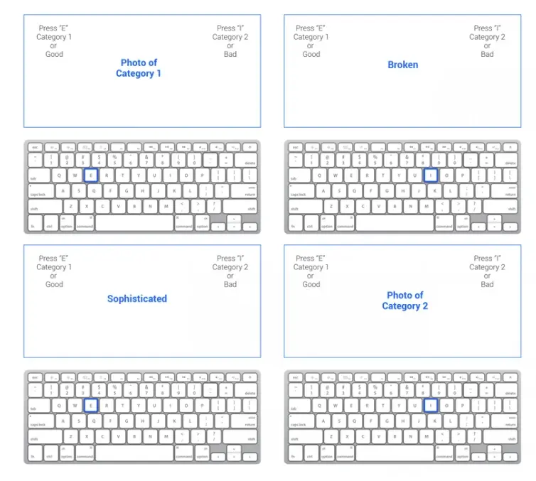 - Değerlendirme görevi 2’deki talimatlar: “Kategori 1 veya Kötü için E tuşuna basın” ve “Kategori 2 veya İyi için I tuşuna basın”.