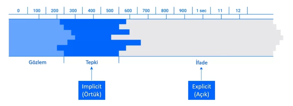 Bir uyarıcı olay meydana geldiğinde (0 ms), beynimiz bilgiyi işlemeye başlar. Bu bilgiyi işlemek ve buna tepki vermek, örneğin bir klavye tuşuna basmak, yaklaşık 200-300 ms sürer. IAT’de geçerli bir tepki 200-300 ms ile 650-900 ms arasında olmalıdır: