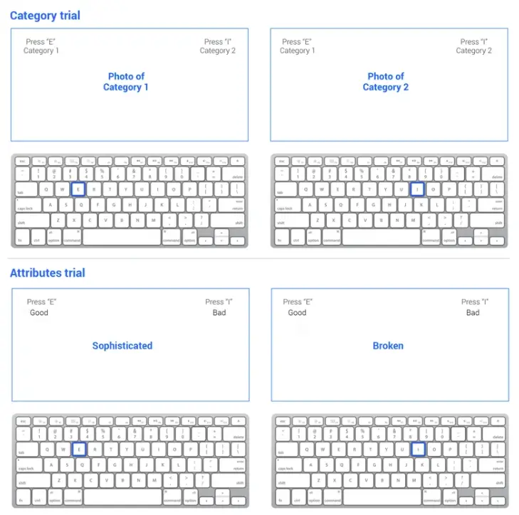 - Kategori denemesi: Katılımcılar yalnızca Kategoriler grubundan (Kategori 1 veya Kategori 2) uyarıcıları görürler. Köşedeki talimatlara göre “E” veya ‘I’ harflerine basarak bunları doğru kategoriye atarlar (örneğin, Kategori 1 uyarıcıları için “E”ye, Kategori 2 uyarıcıları için “I”ye basabilirler).