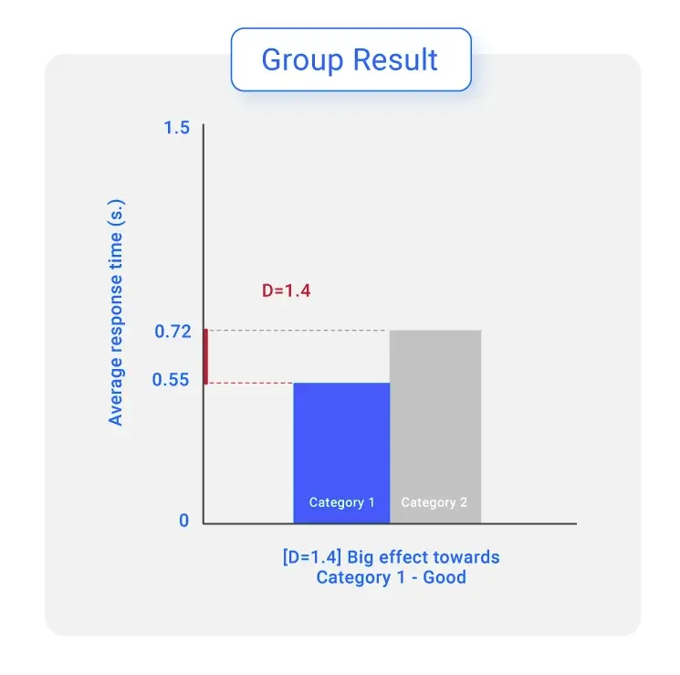 Tipik bir IAT sonucu aşağıdaki grafikte olduğu gibi görünür. İki çubuk, “Kategori 1 veya İyi” ile “Kategori 2 veya İyi” talimatları altında uyaranları sınıflandırmak için ortalama tepki sürelerini gösterir. Daha kısa çubuk, daha hızlı bir sınıflandırma ve dolayısıyla bu özelliğin bu kategoriyle daha güçlü bir ilişkisi olduğunu gösterir. D, her bir kategorinin zaman dağılımları arasındaki farkın boyut etkisidir.
