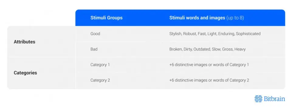 IAT, ekrandaki uyaranların (kelimeler veya görüntüler) hızlı bir şekilde sınıflandırılmasını içerir. Katılımcı, bunları mümkün olduğunca hızlı bir şekilde doğru kategoriye veya özellik grubuna atamalıdır. Bu nedenle, IAT iki kategori ve iki özellik grubu gerektirir. Kategoriler, karşılaştırılacak iki hedeftir.