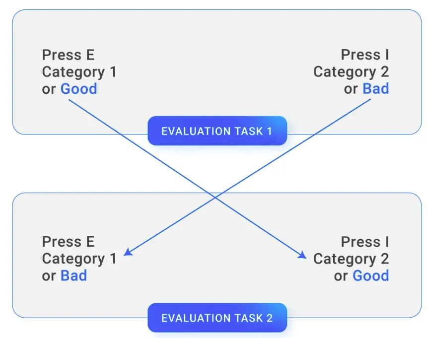 Katılımcılar, köşelerde yer alan talimatlara göre “E” veya ‘I’ tuşlarına basarak uyaranları sıralamalıdır. Talimatlar artık kategorileri ve özellikleri birleştirir (ör. “Kategori 1 veya İyi için E tuşuna basın”; “Kategori 2 veya Kötü için I tuşuna basın”). Talimatlar, önceki alıştırma görevinde verilen talimatlarla tutarlıdır (ör. Kategori denemesi: “Kategori 1 için E tuşuna basın”; “Kategori 2 için I tuşuna basın”; Özellik denemesi: “İyi için E tuşuna basın”; “Kötü için I tuşuna basın”).